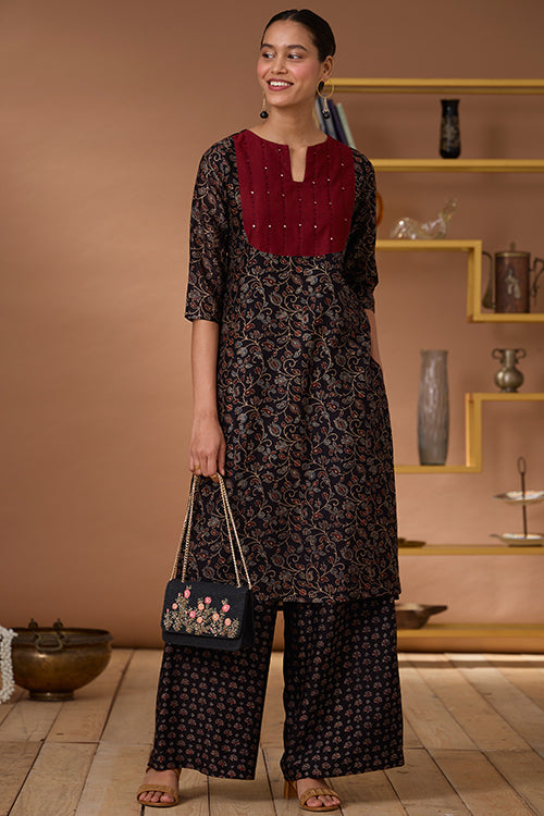 Okhai "Ruby Armour" Hand Embroidered Beadwork Handblock Printed Chanderi Silk Ajrakh Kurta Pant Set with Dupatta