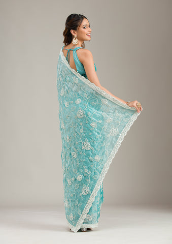 Teal Green Threadwork Georgette Saree