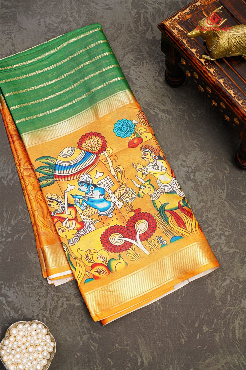 GREEN and MULTI KALAMKARI PRINT SILK Saree with FANCY