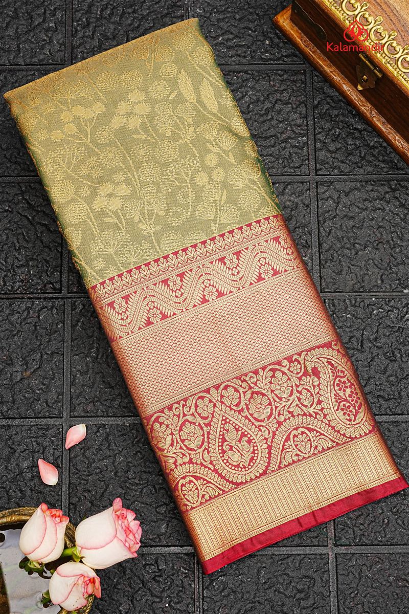 LIGHT OLIVE GREEN and GREEN FLORAL JAAL SILK BLEND Saree with SEMI KANCHIPURAM