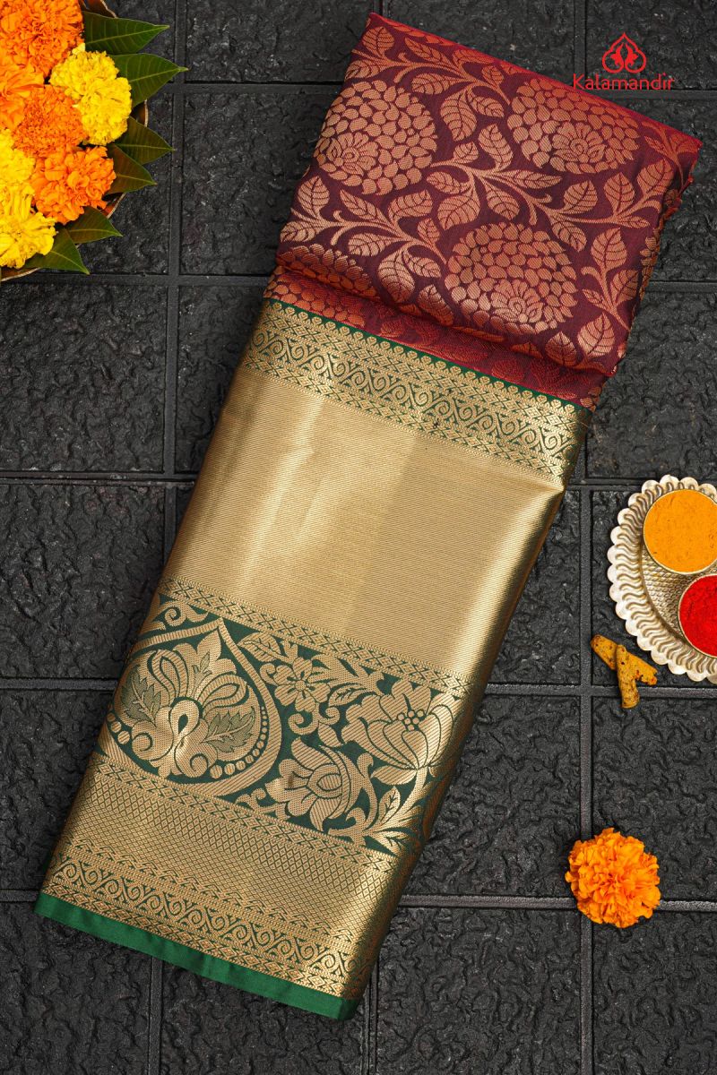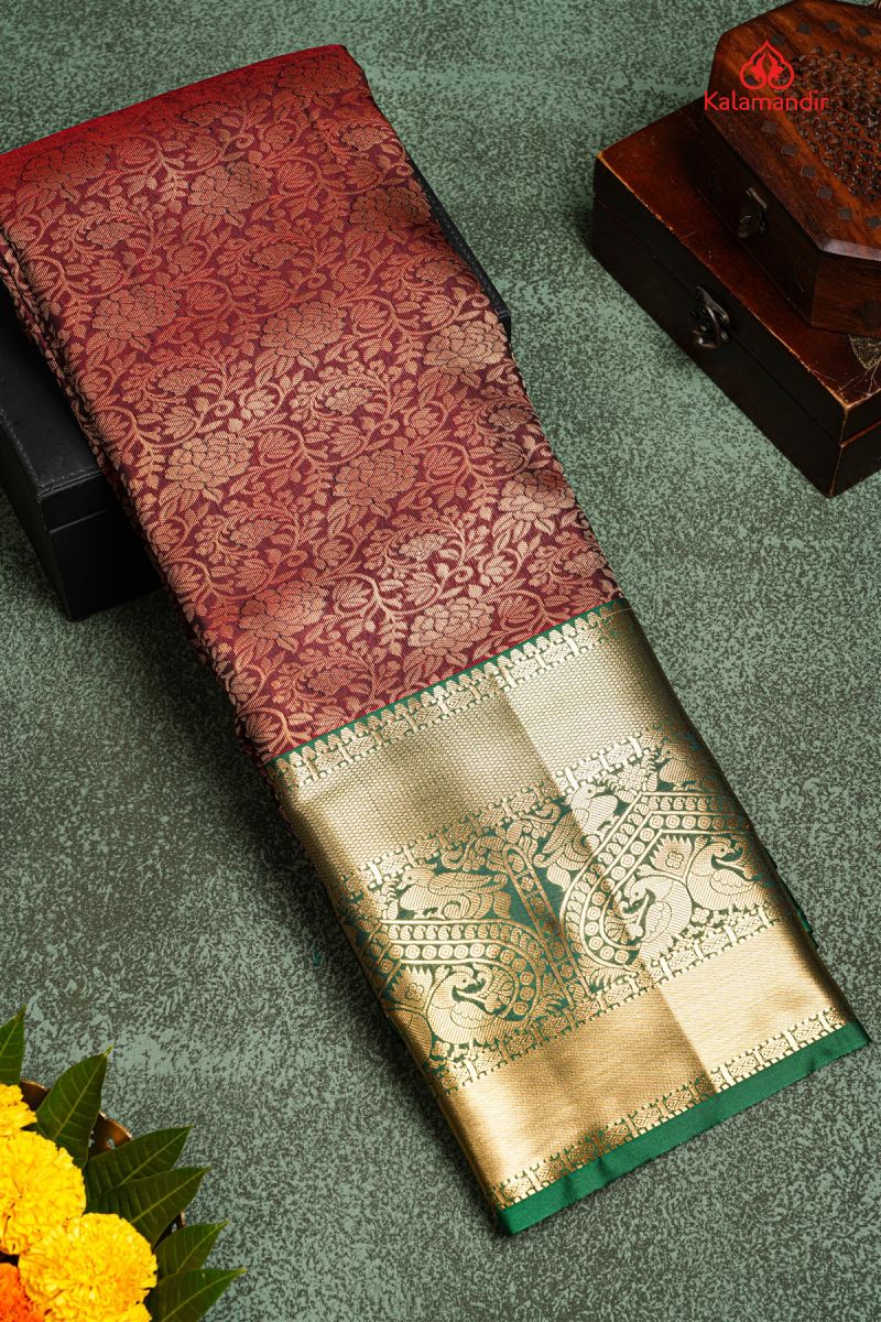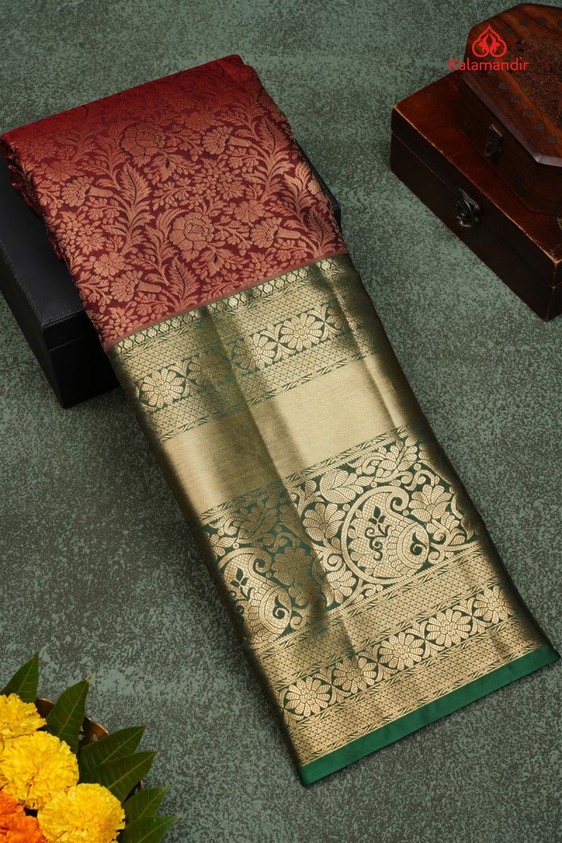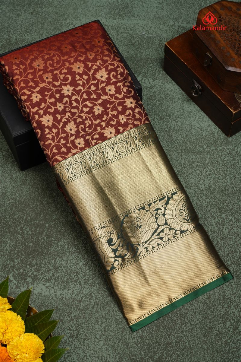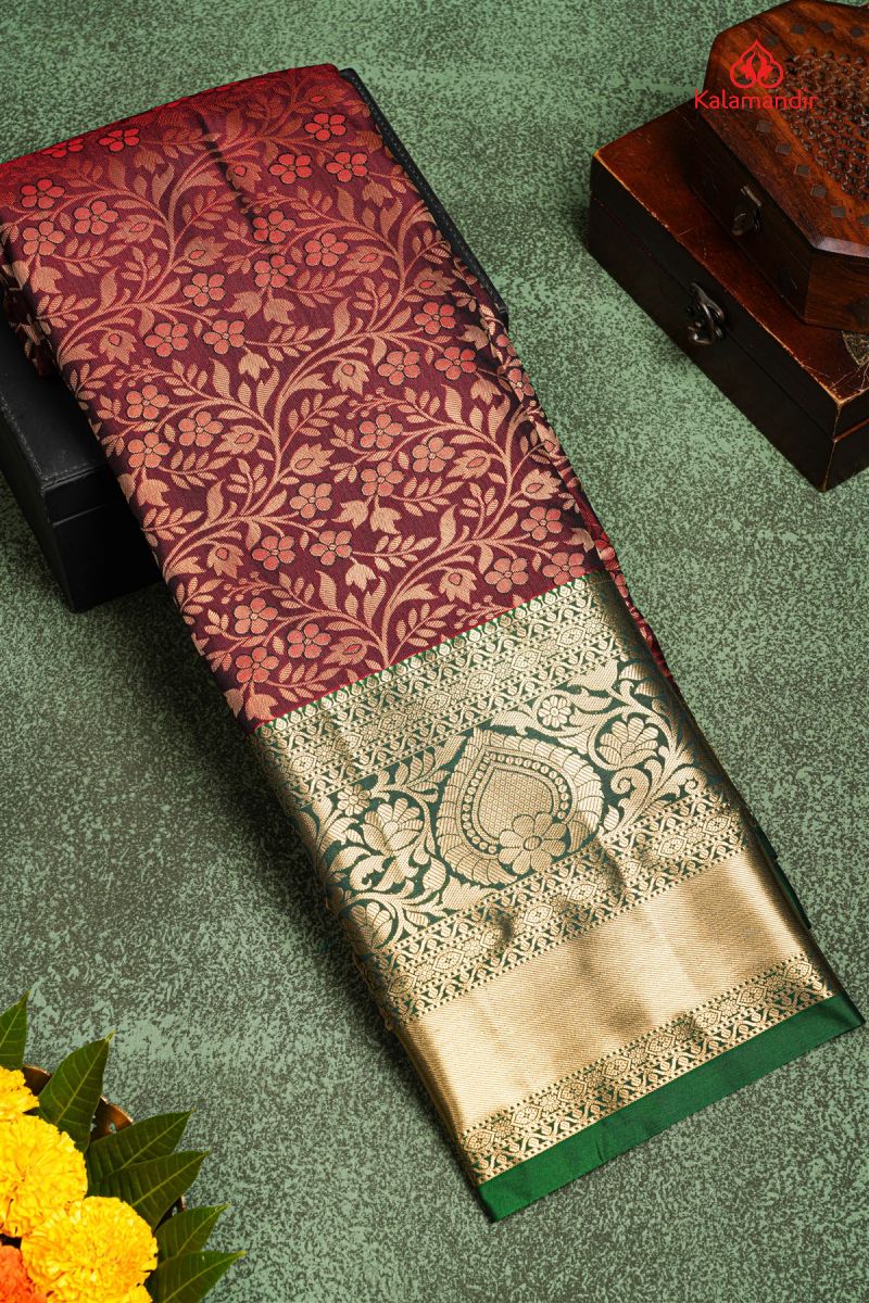 MARRON and GREEN FLORAL JAAL SILK BLEND Saree with SEMI KANCHIPURAM
