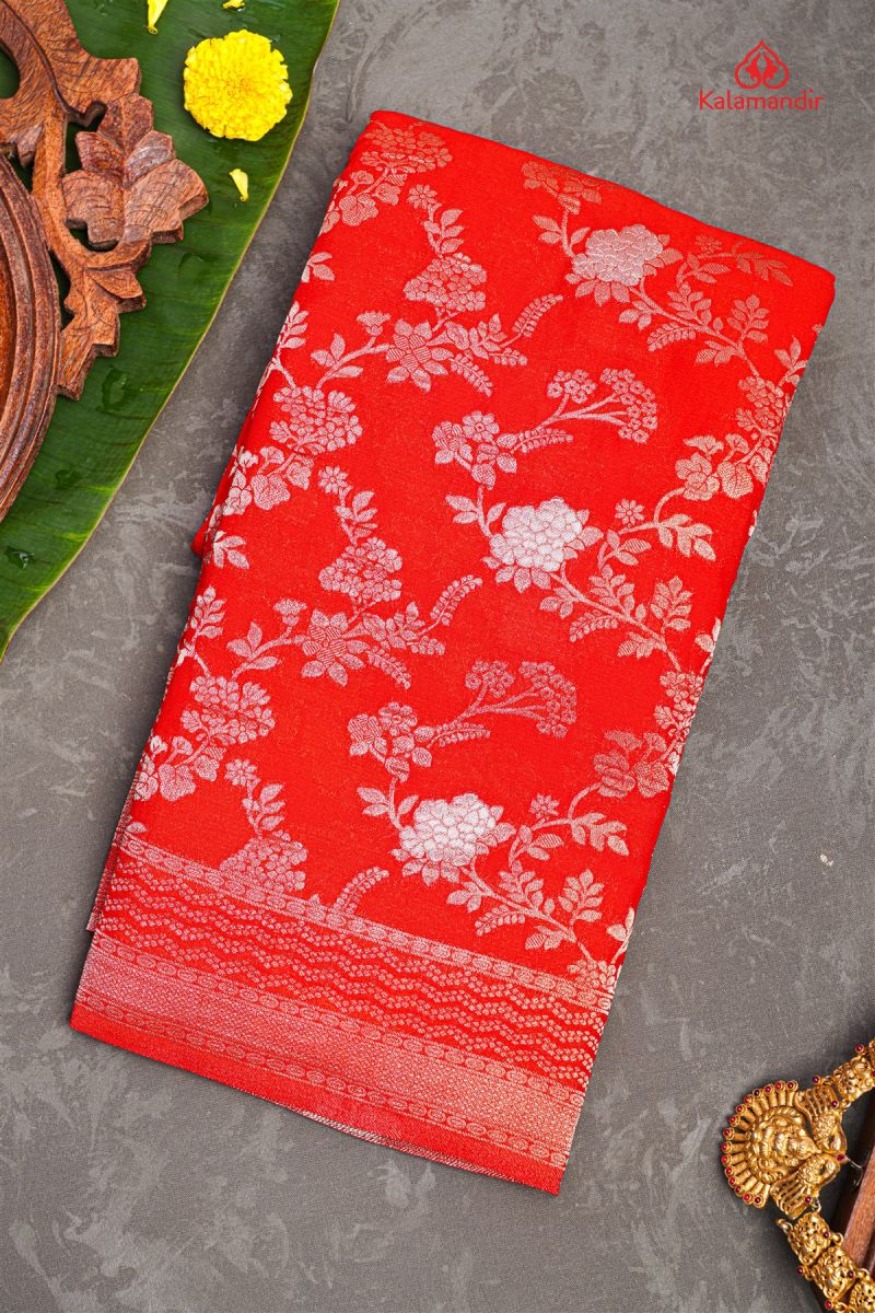 RED and GOLD FLORAL JAAL GEORGETTE Saree with BANARASI